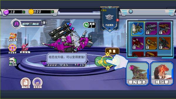 1.进入游戏主界面,玩家可以查看能够解锁的机甲恐龙角色,并从冒险副本和排位赛中选择玩耍。