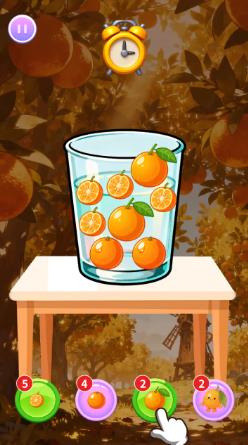 2、点击选择下方的橘子,将其放入上方的杯子中,确保放置过程中没有橘子掉落。