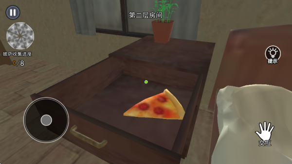 4.如下图所示,小编在床边抽屉找寻到了第一款披萨,将光标移动到披萨上即可收集。继续探索,同时小心伪人才能成功逃离!