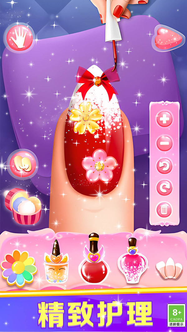 1、提供了堪比专业设计软件的自由创作空间。你可以为每一枚指甲独立操作:精确修剪甲型、选择上百种底色、使用各式笔刷绘制图案。