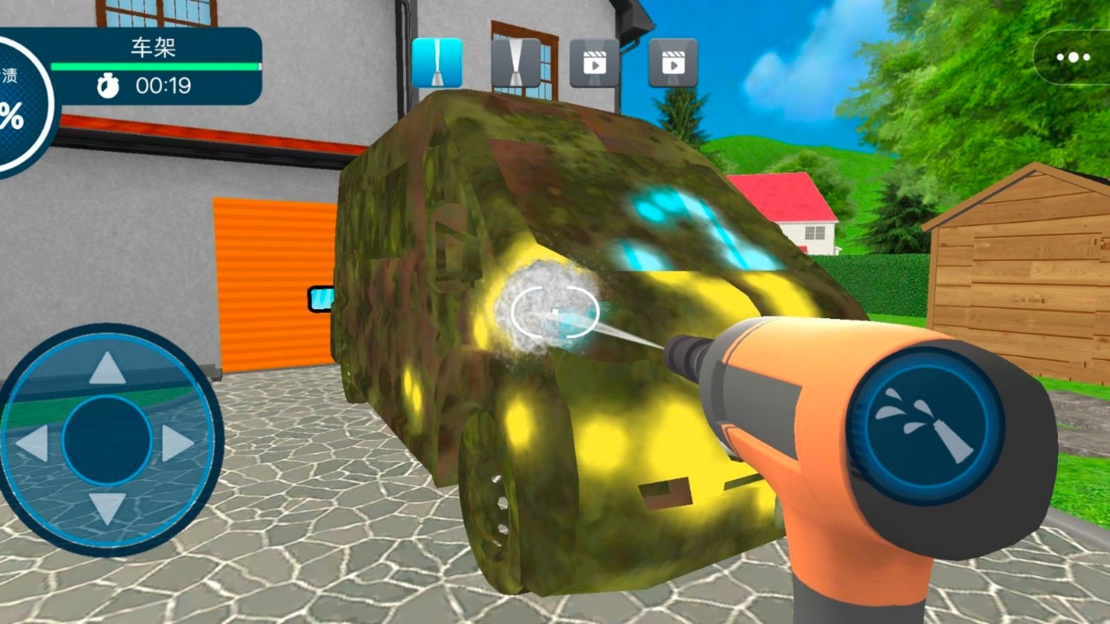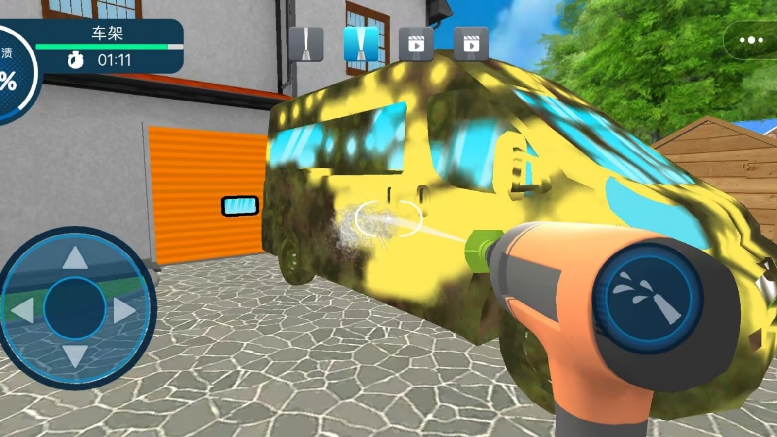 1.玩家首先使用高压水枪冲洗车体表面污渍,通过调整水压与角度应对不同污垢程度与车身部位。