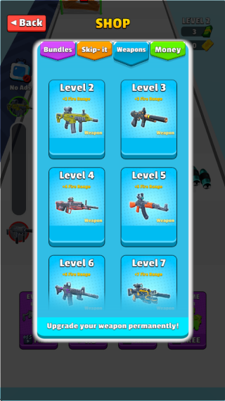 1.进入关卡后,玩家可以消耗金币来升级枪械的初始性能,从而可以在闯关过程中获取更多奖励。