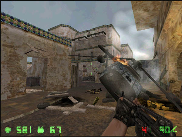 黑鹰已经坠落,伤亡是肯定有的,但仍然有几个三角洲队员深陷重围,“绝对不能让一个弟兄留下“!于是我开始拯救行动。我呆在燃烧着的黑鹰旁边,这时候敌人已经蜂拥着冲了过来,我端起了手中枪,嗒嗒几个点射。继续往敌人腹地挺进,来到一个房间,解决掉冲出来的两个敌兵,四周一看已经没有路了,我大骂一声一梭子子弹打在了墙边的几个木箱上,墙上一个破洞显了出来,就从这里过去,在铁架上得到炸弹,沿木板上到二楼,只见墙面上红光一闪一闪的,按动5号键可以设置炸弹,然后闪到一边把头一埋按动了手中的引爆器,轰隆一声,墙被炸出一个大洞,我刚刚探出头去观察,就见一束红光扫了过来,我连忙退了进来:狙击手!我装好弹作了一个深呼吸,闪电般冲了出去,子弹不停的呼啸射出,对面楼上发出一声惨叫,敌狙击手栽了下来!上到房顶,进入房间便找到一名三角洲队员,了解了附近的敌情和失散的战友,我们便冲了出去,不能让他牺牲掉,所以我冲在了前面。掩护他进了一个水塔,安全后我便继续搜寻其他失散的战友,旁边两扇木门不能打开,用枪将门后挡住的木箱打烂就可以通过了,来到大院,我军的直升机正要降落,但地面和高墙上全是敌兵,我换成了机枪愤怒的杀了过去,地面全部清除完毕,我在返身寻找队友,一辆吉普车冲了过来,车上跳下几个敌兵,好在我早有准备,枪枪爆头!在旁边的房间找到已经被俘的战友,这家伙看来是吓傻了,呆在原地不肯前行,我告诉他:有我在,一切OK!终于我们安全来到大院,黑鹰已经等候多时了...难点提示:打烂身边任何木箱!