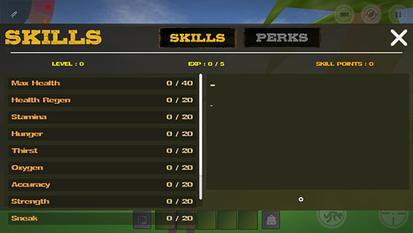 4、技能界面需攒经验得技能点,前期优先点生命值、耐力这类生存属性,强化自身续航能力。