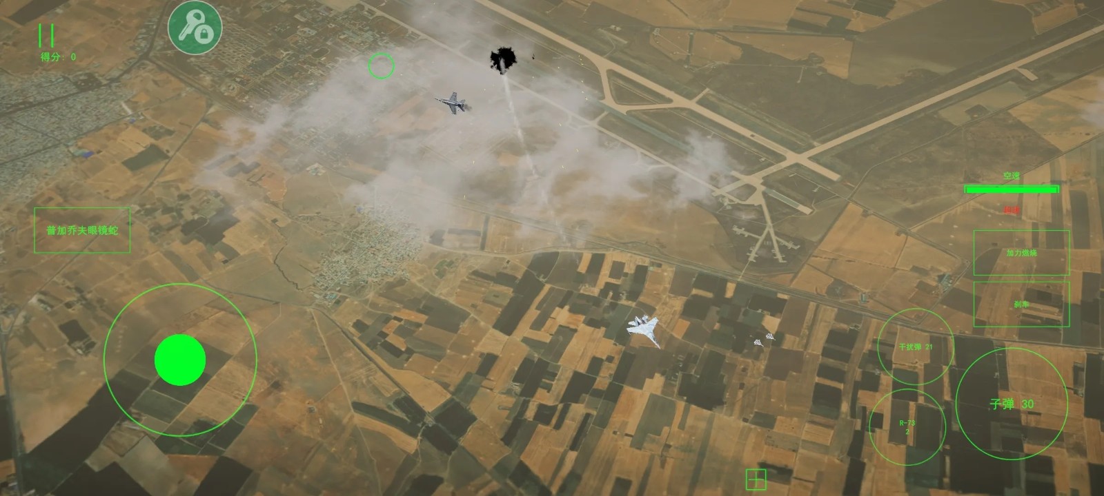 1、喷气式战斗机模拟器的操作很简单,左下方是控制飞机的上下四个方向,攻击在右下角。