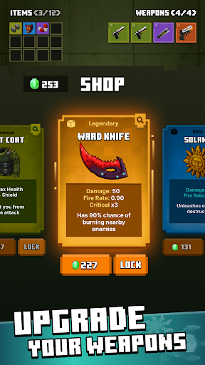5、当玩家坚持一段时间后所有怪物会全部消灭,此时会进入商店,在商店里玩家可以用拾取的绿色晶石来购买不同的装备和武器。