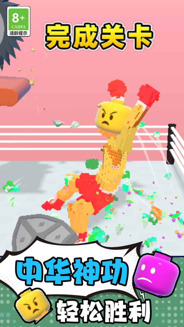 1、击打对手不仅造成伤害,还会使其身体崩解出像素块散落在地。玩家操控角色触碰吸收这些像素块后,能永久性地增大自身体型。