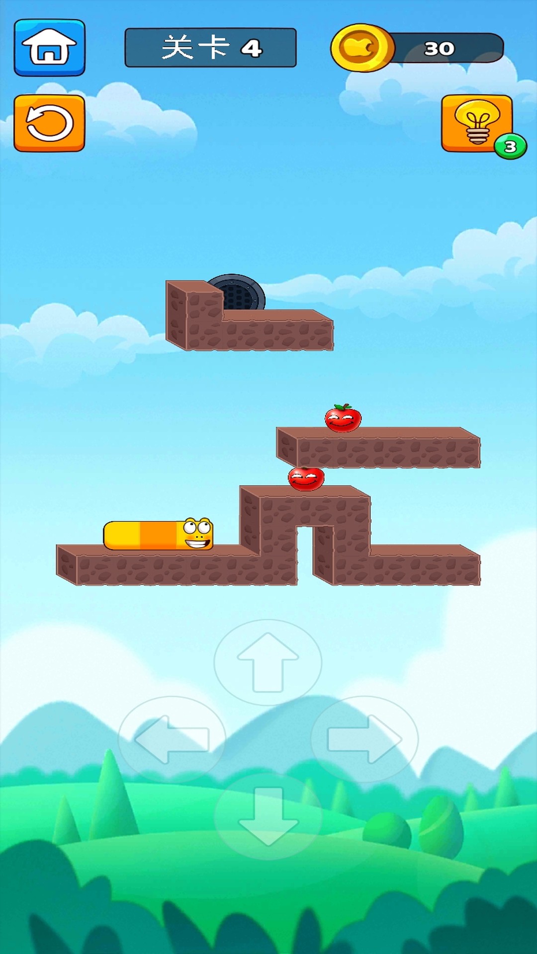 2.每个关卡需收集场景中全部苹果后方可开启终点通道,最终抵达平台指定出口即为通关,过程中需合理规划路径顺序。