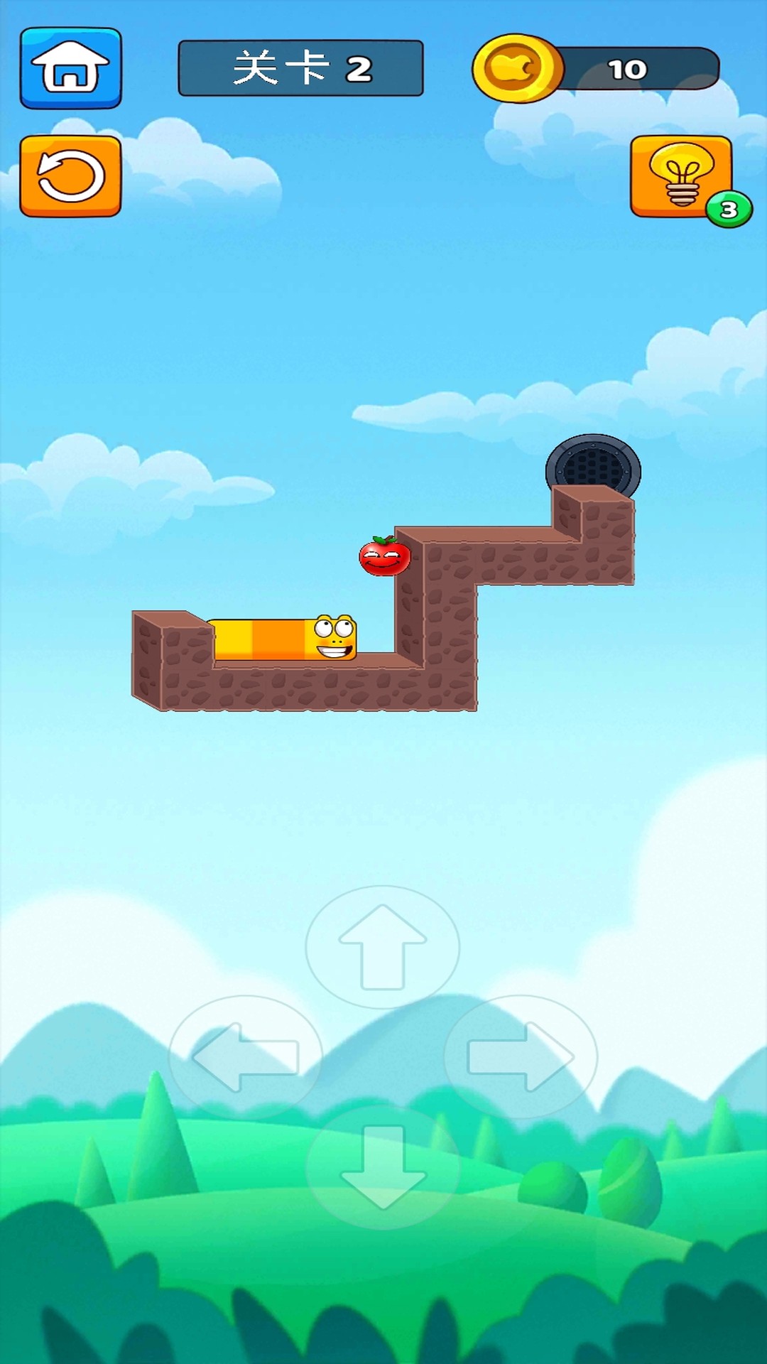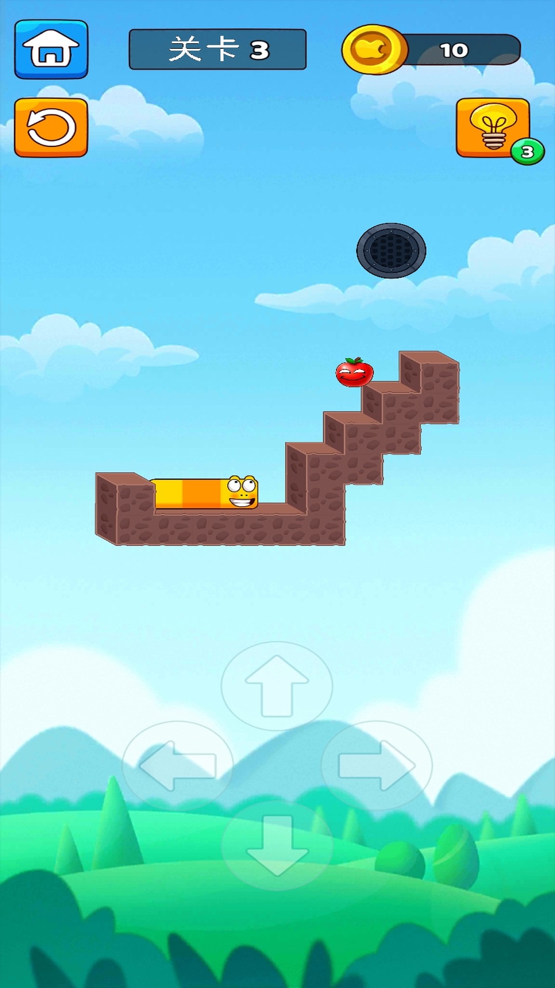 4.在第一个关卡中,使用画面下方的“上下左右”四个按钮来控制蛇蛇蠕动前进到终点吧!此外,还有提示道具能够使用。