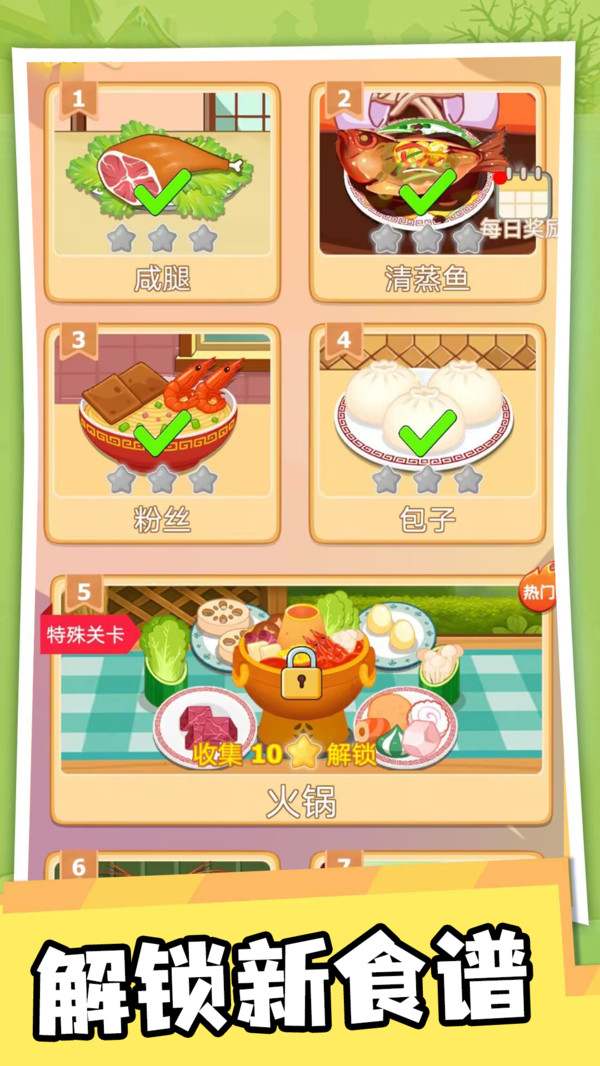 2、初始开放基础菜品做法,随着厨艺提升或完成特定任务,解锁更复杂的高阶菜谱与特色菜品。