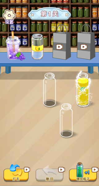 1、首先点击装有目标颜色液体的杯子,再点击空杯或装有相同颜色液体的杯子,完成 “倒水” 操作,开始进行液体分类。