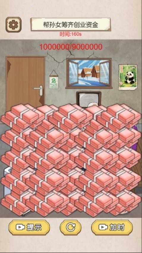4、将钞票拖动到墙壁上,拖动到桌子上,拖动到老爷爷身上,拖动到老奶奶身上,将全部钱花完才能胜利