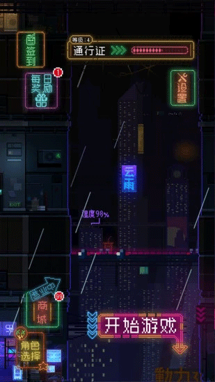 1、赛博朋克风格像素城市,音乐律动中体验节奏冒险与战斗。