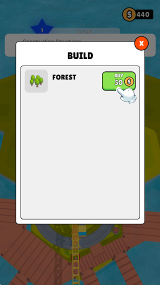 3.如下图所示,林场建造完毕之后长按林场,会出现道路,将道路连接至下方的小屋,让伐木工将林场的树木运送至小屋吧。