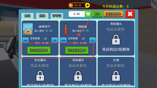2、点击左侧购物车图标打开采购菜单,选择曲奇饼干、辣椒酱等解锁商品加入购物车,确认后完成首批进货。