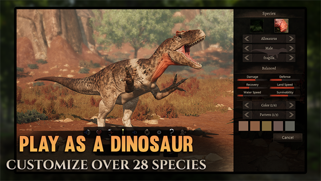 以史前生物恐龙为主角的生存冒险游戏,在这里您将回到侏罗纪时代,将扮演最真实的恐龙生物,人类尚未出现,恐龙依旧是地球的霸主,但是大自然力量依旧可以摧毁一切。玩家要在充满复杂AI生物和多达200个其他参与者的丰富生态系统中扮演恐龙,而恐龙的造形、肤色、标志等等由玩家自行决定,想要崇尚自然肤色,或者搭配迷彩让自己与背景融合为一体,还是创造出色彩缤纷与众不同的恐龙全看玩家的选择。