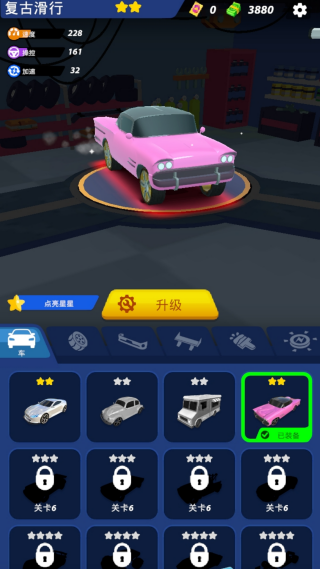 3.每次闯关胜利后,你将会获得丰厚的奖励和配置道具,你可以用它们来升级你的汽车性能。