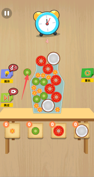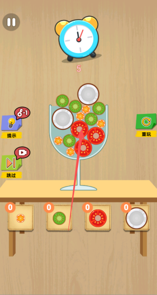 4、过程中有水果掉落,挑战直接失败,可选择重玩,重新开启关卡,或借助提示获取摆放思路。