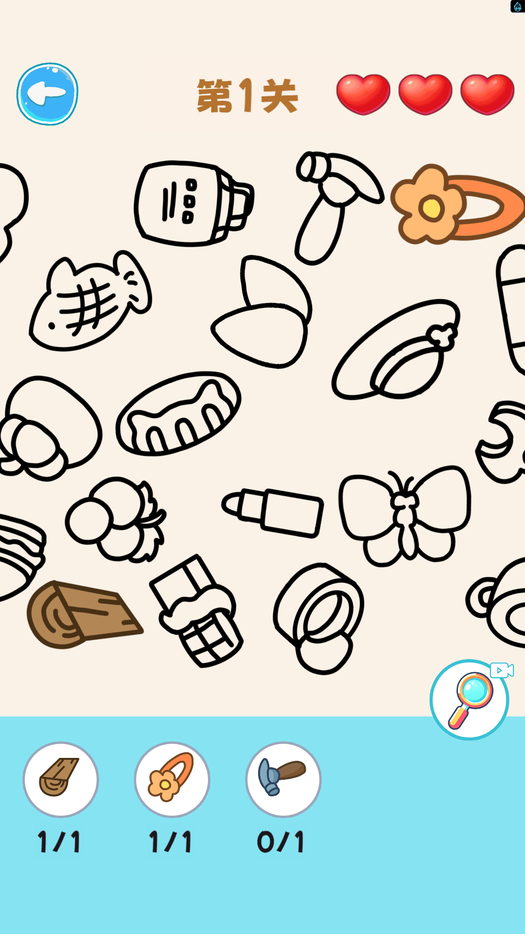 3、注意画面中重复出现的元素,区分目标物品与干扰项,图中有多个蝴蝶结、篮球,需对照底部目标栏,筛选出匹配的物品而非重复的干扰元素,如果点错会消耗红心。