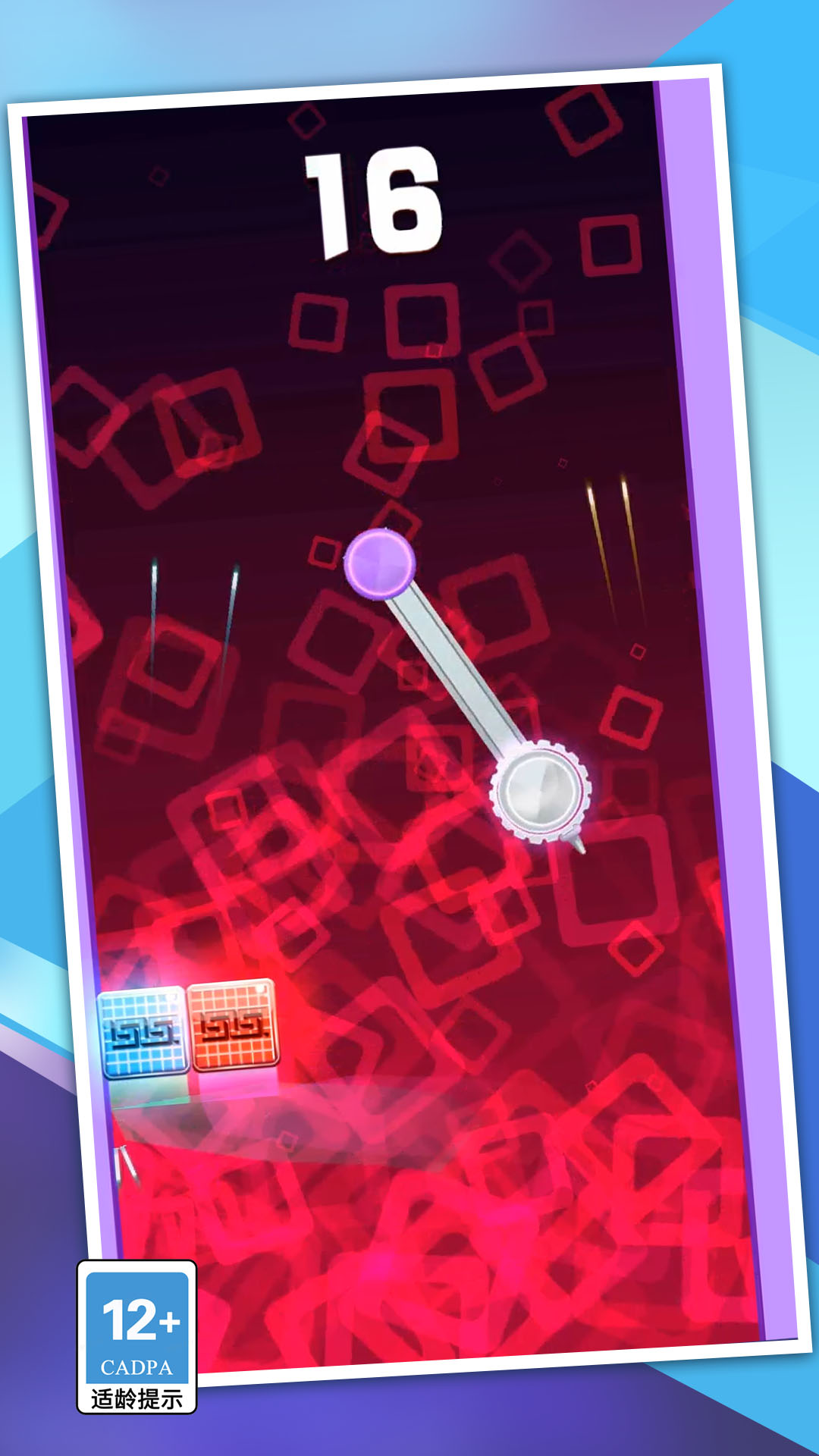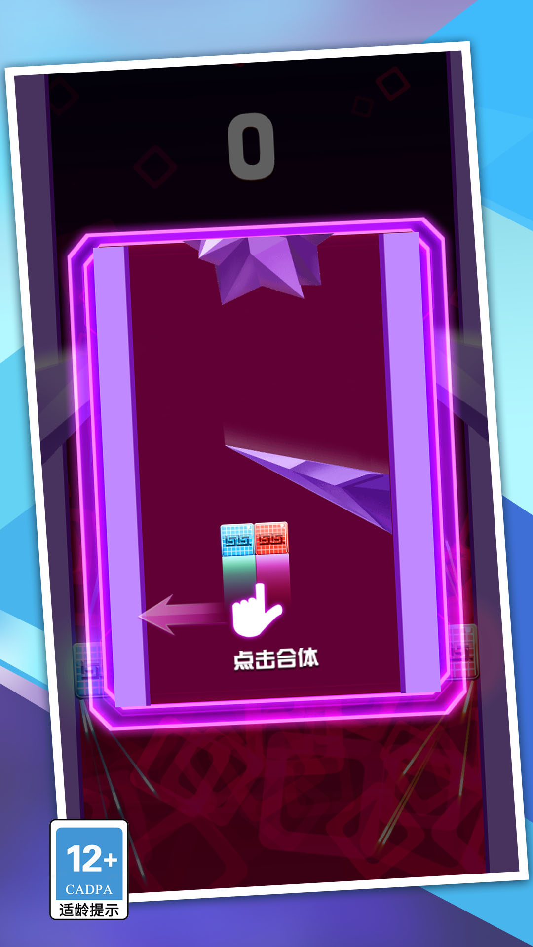 玩家要帮助画面中的红蓝两个方块躲迎面而来的各种障碍物。点击屏幕,两侧的方块就会朝着你点击的位置聚拢,从而躲避障碍物。
