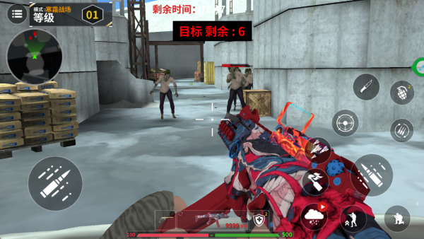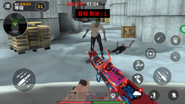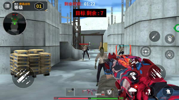 1、玩家需利用奔跑、滑铲等动作在场景中高速穿梭,同时将枪口对准四面八方涌来的尸潮,进行近乎不间断的射击。