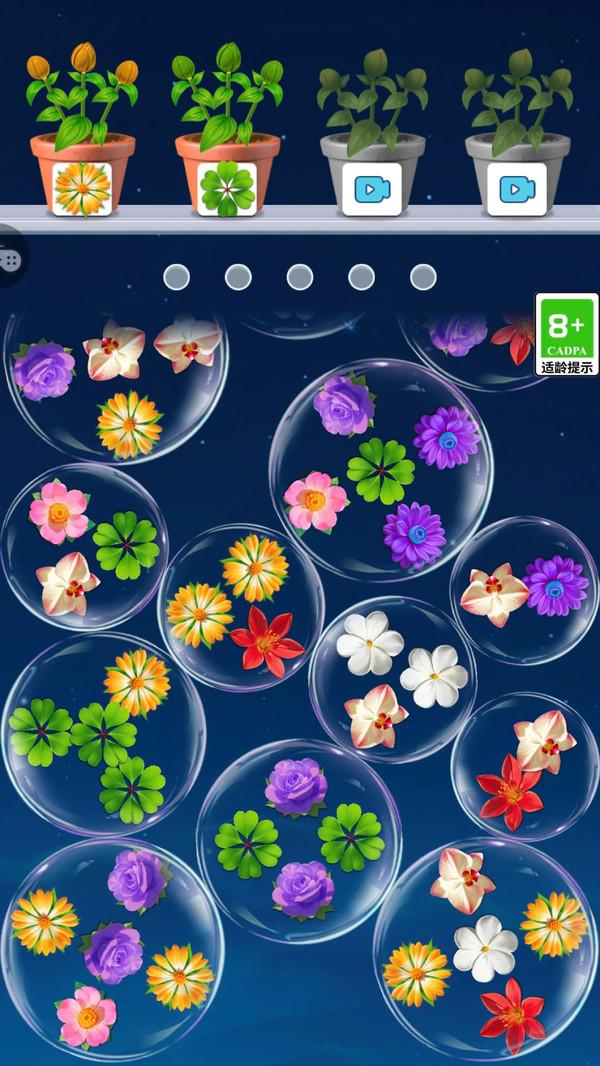 4、进入更高关卡后,面对含有多朵鲜花的气泡,精准筛选相同颜色或品种的鲜花点击,逐步完成消除任务。