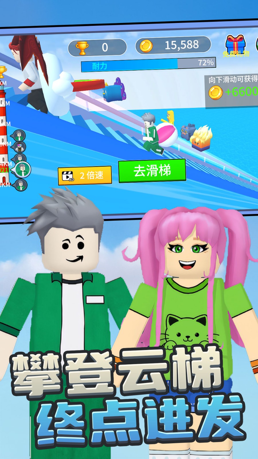 欢乐跑跑大冒险是一款有趣的动作跑酷游戏。朝着楼梯高处不断攀登,在体力耗尽之后顺着楼梯旁的水流滑滑梯顺流而下,将会根据玩家攀登的高度来获取不同数额的金币奖励。随后玩家可以使用金币来购买道具,帮助角色能攀登楼梯到更高的地方,完成更长距离的滑梯挑战。