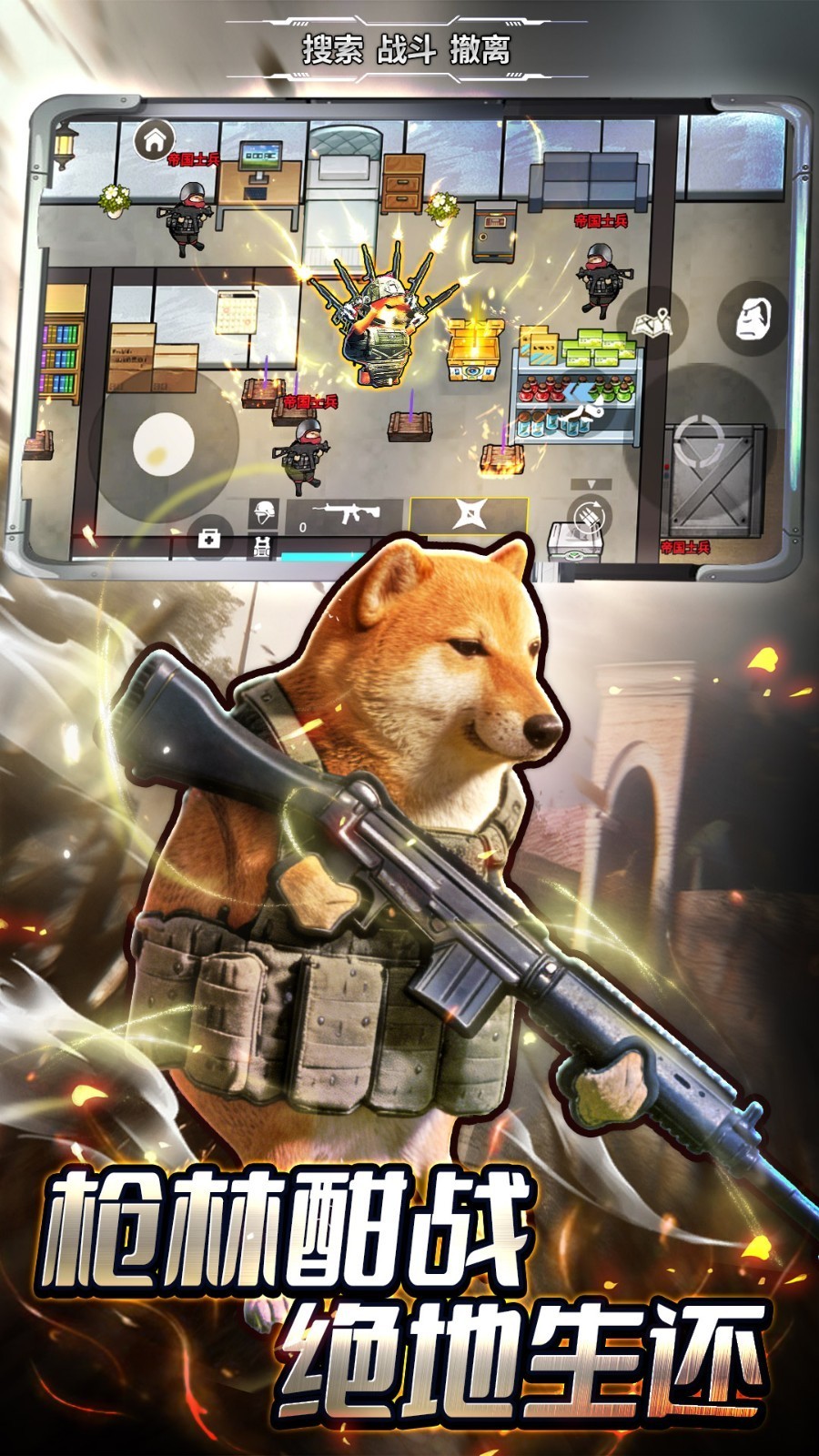 柴犬主角手持加特林、火箭筒等重武器,搭配 毛绒特效 和 Q版爆炸云,缓解战斗紧张感。