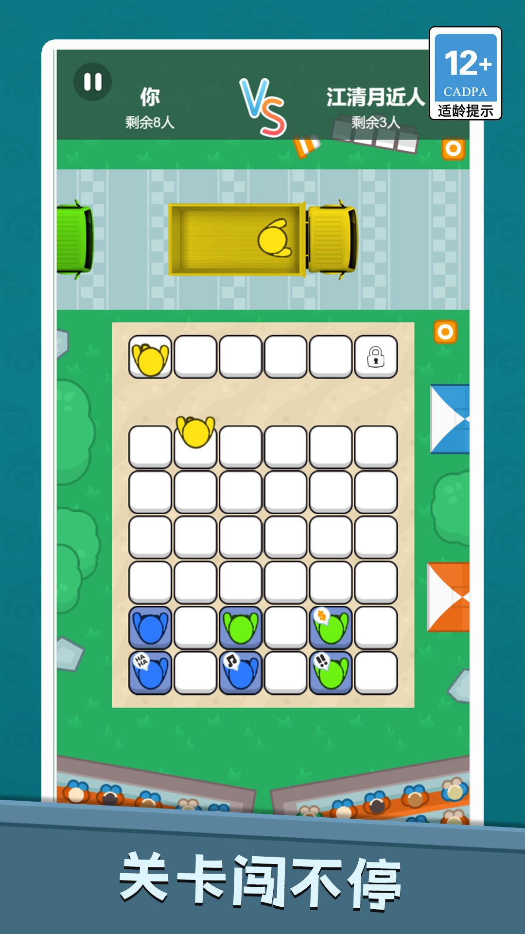 2、进入第一关,此关卡剩余12人,先通过 “消除” 功能移除多余的灰色角色,再用 “换位” 调整同色角色的排列顺序。