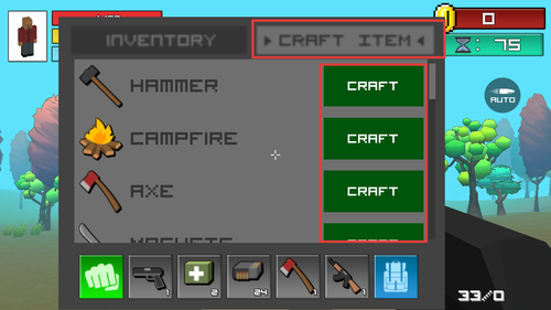 2、前往CRAFT ITEM界面,消耗对应物资点击 CRAFT按钮,制作锤子、篝火等工具,提升资源获取效率。
