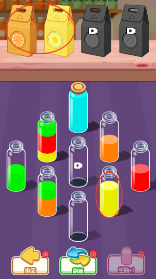 4、遇到操作失误时,使用撤回或刷新功能重新调整,按关卡要求完成所有液体分离,达成闯关目标。