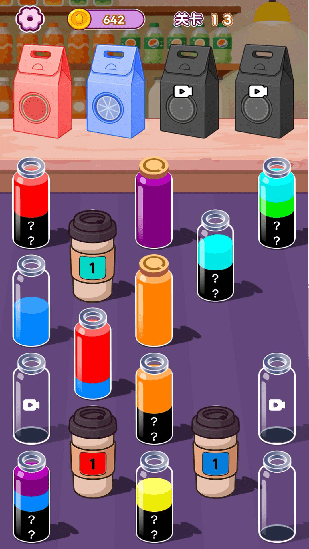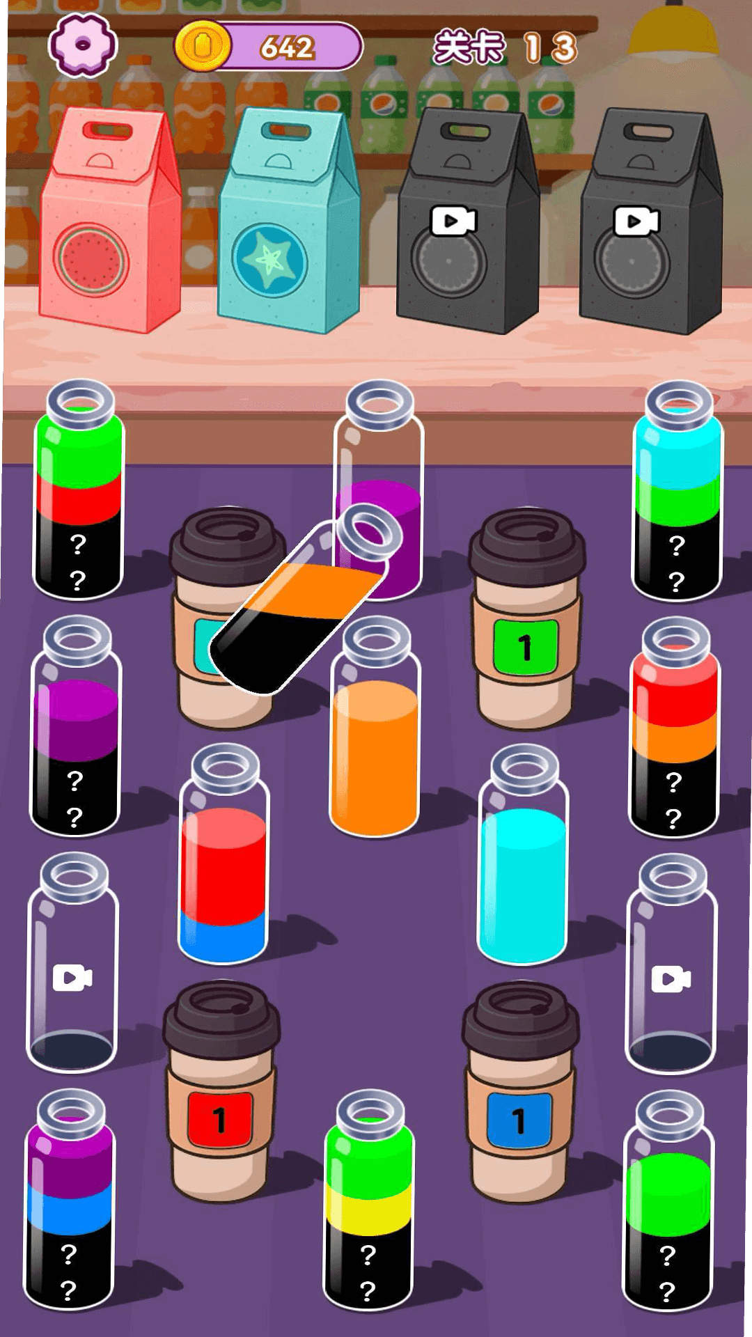 2、成功让单一容器装满同色液体后完成消除,借助空瓶辅助调整,为后续倾倒创造更多操作空间。