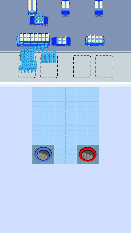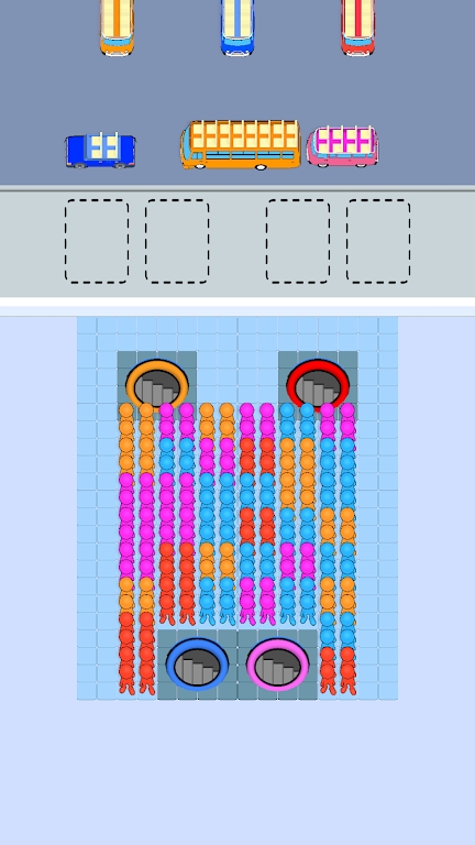 1、玩法是通过点击屏幕下方不同颜色的“洞”,来收集对应颜色的乘客,并引导他们上车。