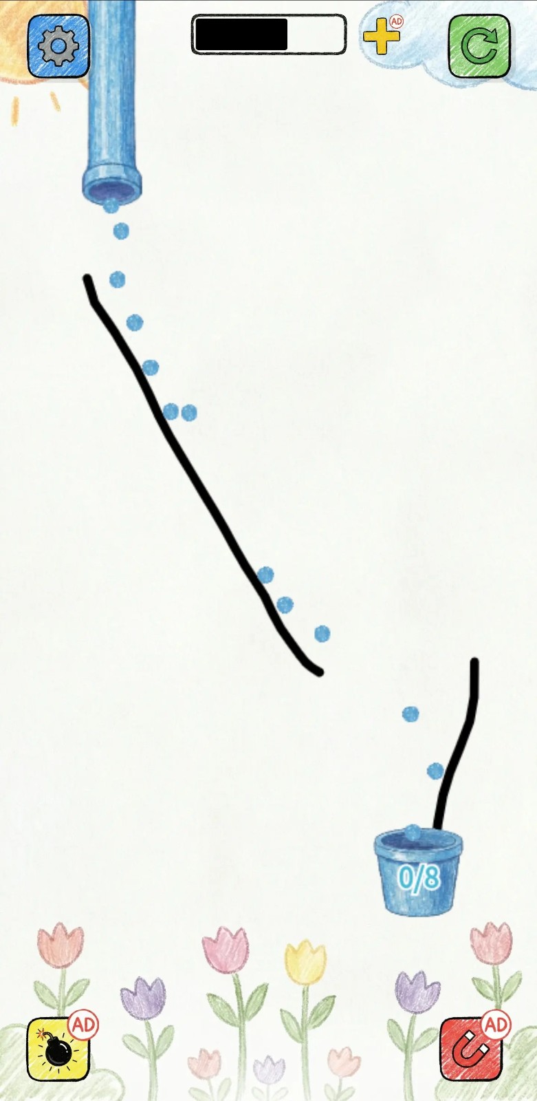 1、在关卡中,你需要通过在屏幕上画线,构建斜坡或轨道,引导彩色小球掉入对应的花盆。