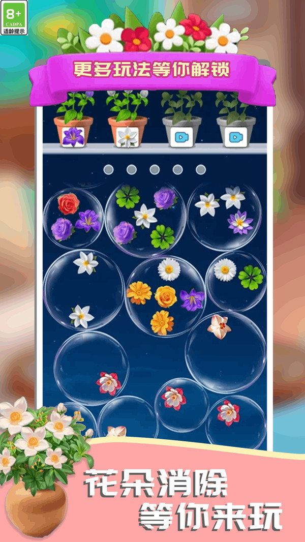 1、游戏核心规则是 “集齐3朵相同的花消除花盆”,点击气泡内的花元素时,优先选择同种类花朵,集中向对应花盆填充。
