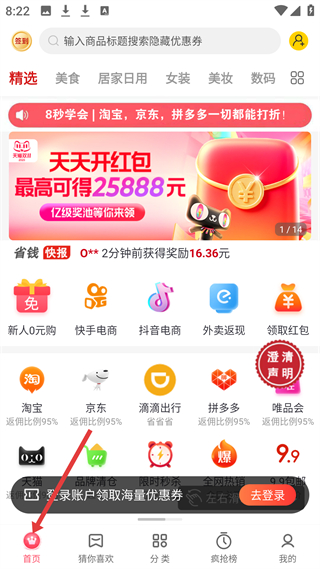 1、首页,有搜索栏、签到入口,展示精选等分类,还有天天开红包活动、新人0元购等功能入口及淘宝、京东等平台入口。