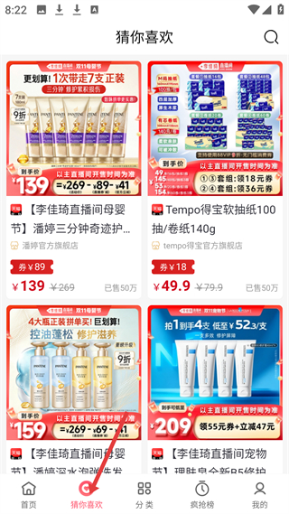 2、猜你喜欢板块,展示潘婷护发产品、Tempo得宝纸巾等商品,标注价格、优惠及销量,基于用户喜好推荐商品。