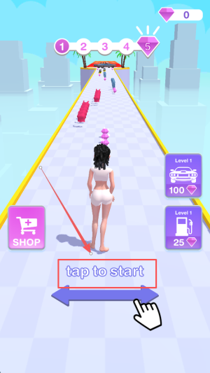 1.时尚启程:打开游戏主界面,点击“tap to start”按钮,开启你的变装闯关之旅。