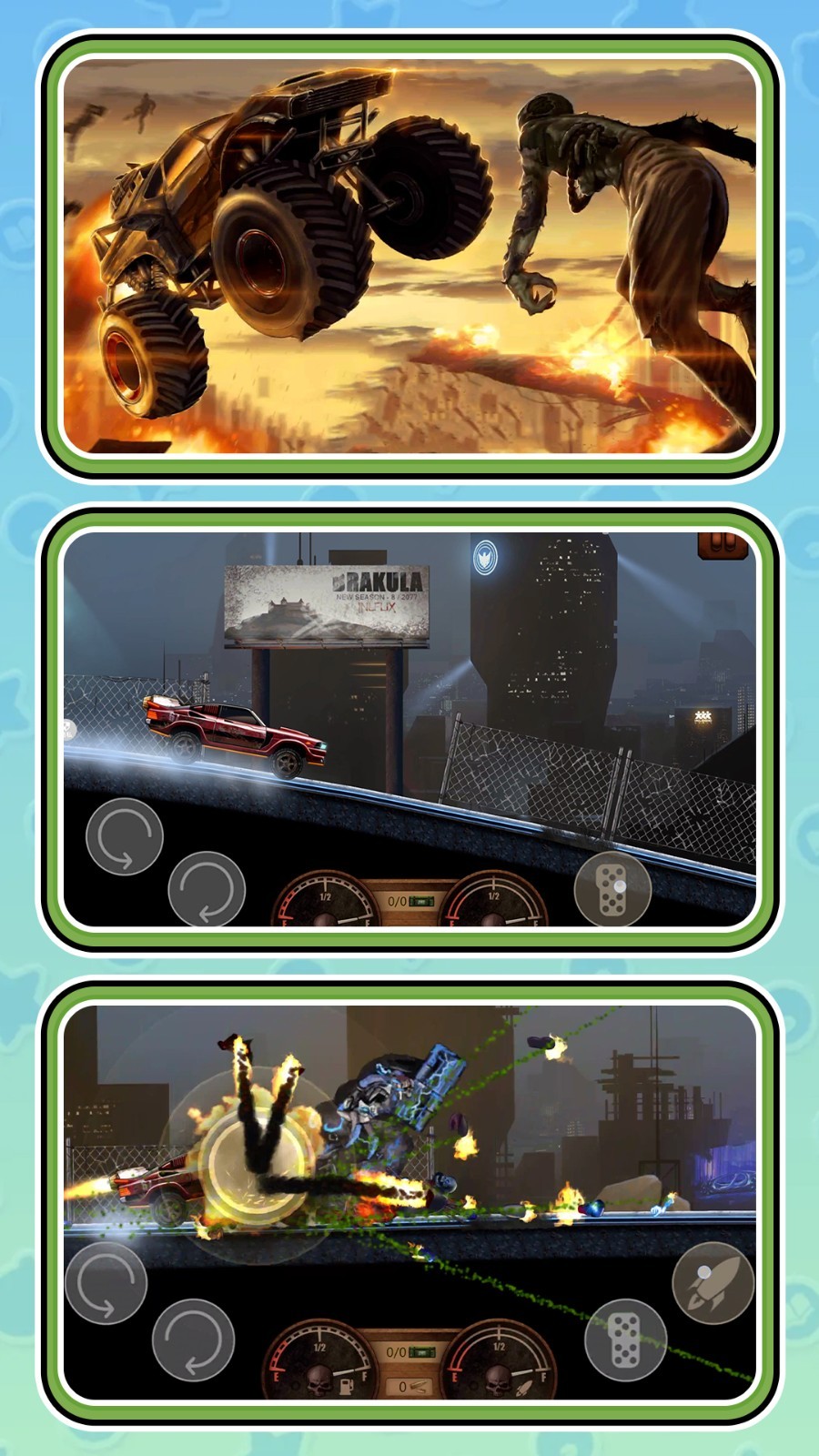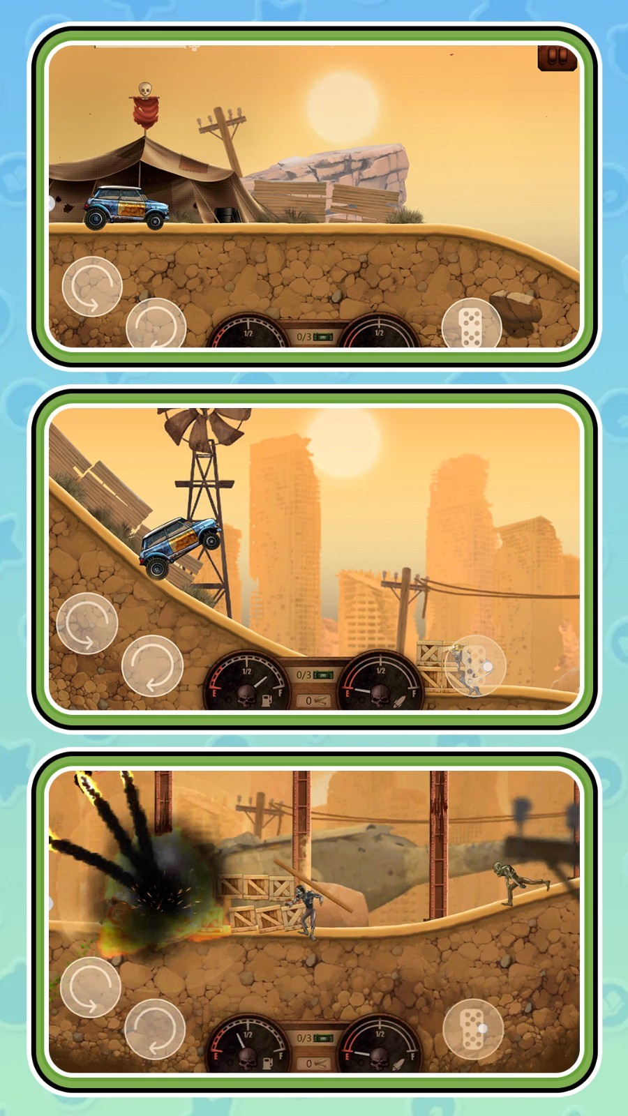 1、让汽车不断提升速度,快速撞击僵尸完成击杀,找到安全的驾驶路线到达目的地。