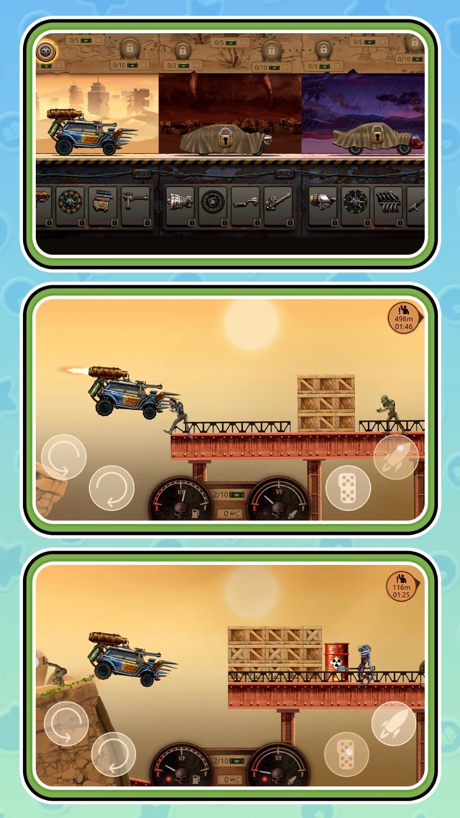 1、驾驶战车冲破成群丧尸的围堵封锁,凭借流畅操控摆脱丧尸纠缠,以最快速度冲出生天达成通关目标。