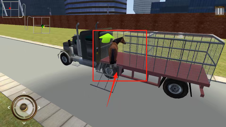4、按照绿色箭头提示倒车,让野马从斜坡登上卡车,完成装载后前往目的地。