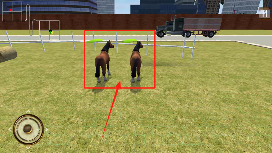 3、用左侧摇杆控制方向,参照小地图找到野马位置,将其赶至红色指定区域。