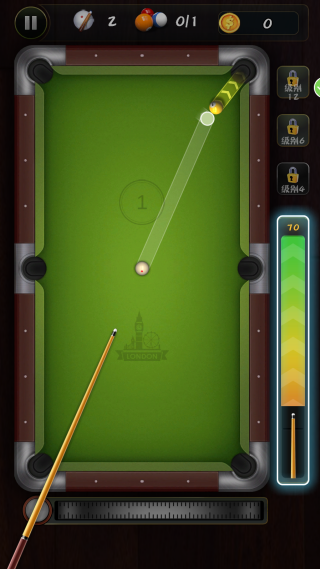 4、在击球前可以自由拖动画面以查看台面全局,并利用辅助线来预判球的碰撞与行进路径。