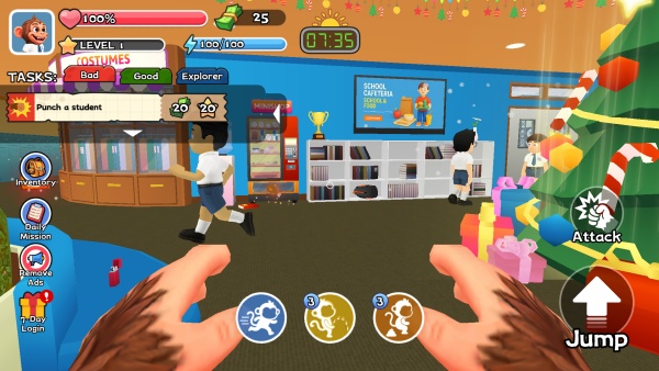 1、用方向键或摇杆控制猴子移动,借助跳跃与攀爬能力,探索教学楼、操场及校园秘密区域。