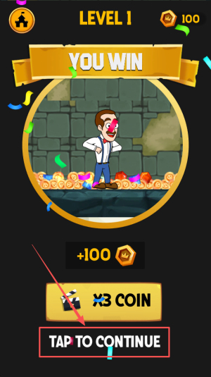 4.通关领奖:画面显示“YOU WIN”与“+100 X3 COIN”时,点击“TAP TO CONTINUE”即可领取奖励并进入下一关。