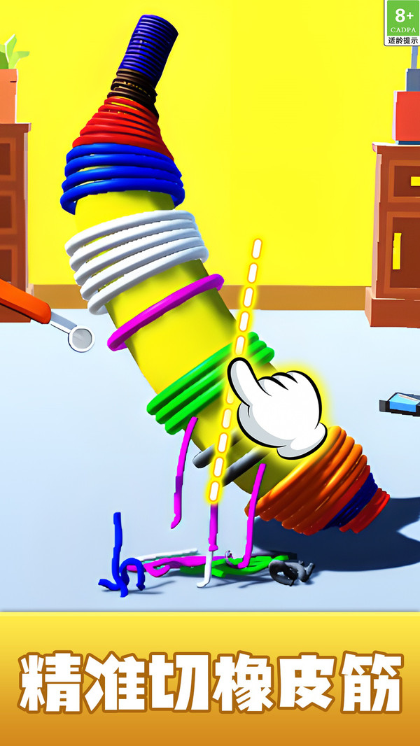 1.游戏的物理反馈效果逼真且夸张,橡皮筋被切断时的收缩与弹开动画流畅而富有张力,极具解压效果。