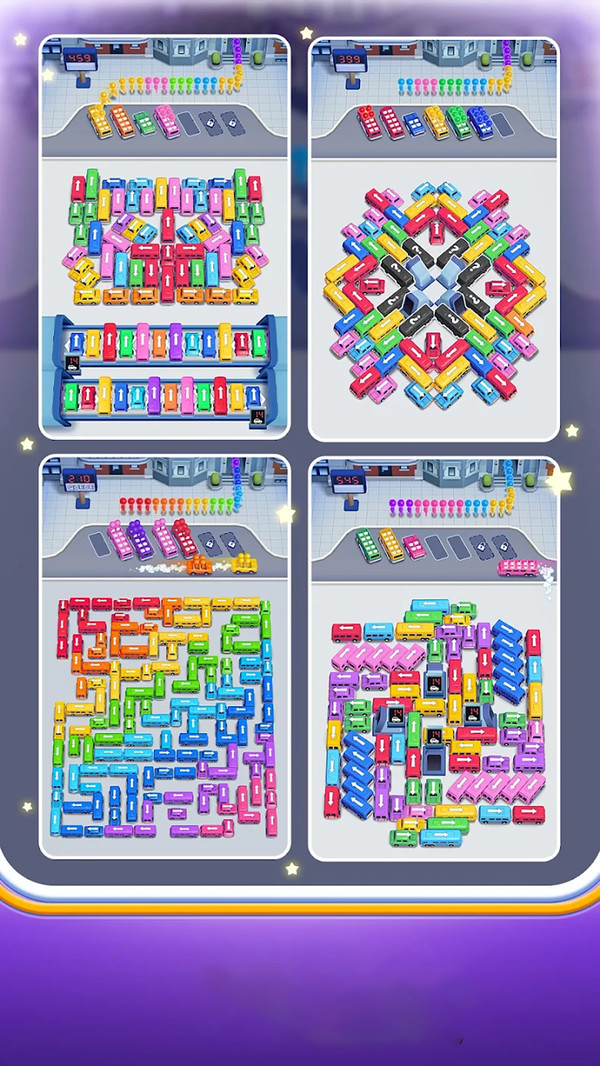 3.玩家需要通过滑动屏幕移动车辆,最终让指定的目标车辆成功驶出拥挤的停车场或混乱的十字路口。