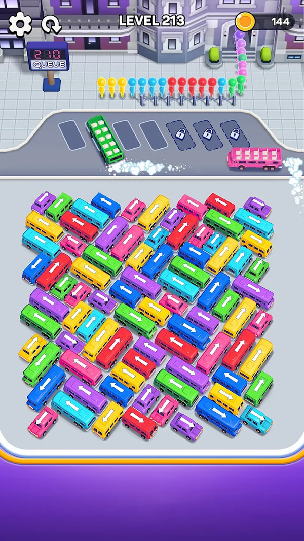 3.随着关卡推进,会出现更多类型的车辆、固定障碍和特殊规则,如单行道或火车车厢,大大增加解谜复杂度。