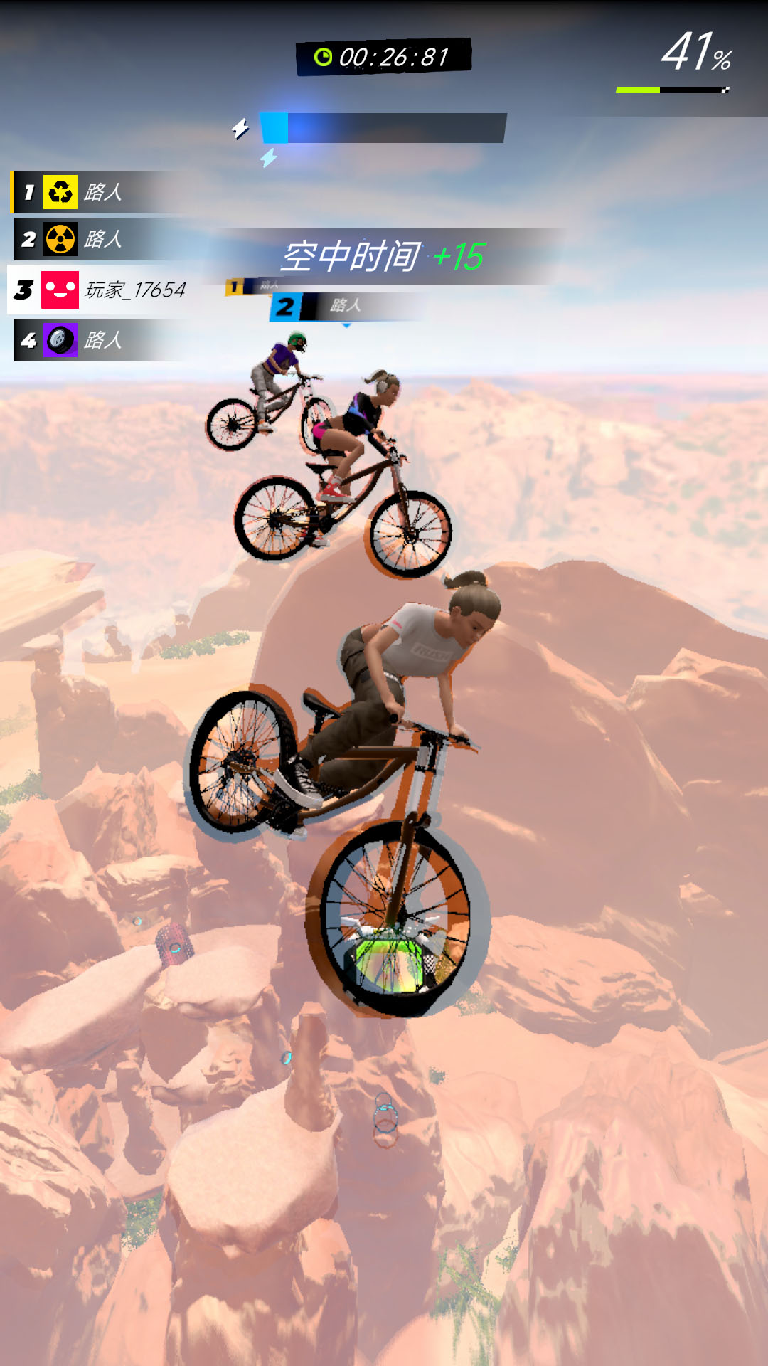 2、骑行中触发各类炫酷特技动作,借助赛道地形完成花式演绎,特技完成度越高得分越高,彰显操作实力,增添骑行炫酷感。