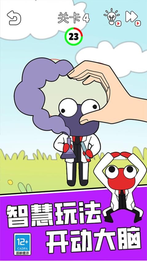 1、在第四关中,需要让这个科学家拿着实验仪器,实验所产生的烟可以与形状相符合。